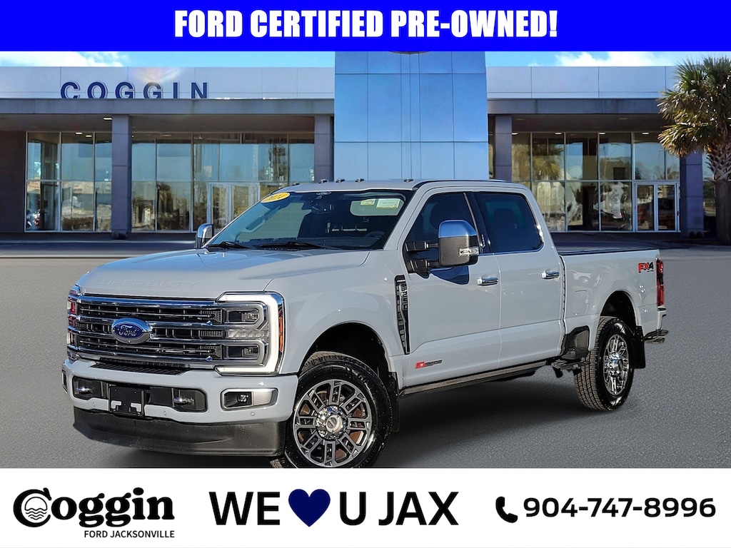 Priced below KBB Fair Purchase Price! 2024 Ford F-250 Limited 4x4 Crew Cab 6.7L HO Power Stroke, Twin Panel Moonroof & Luxury Features This 2024 F-250 Limited in Glacier Gray represents the peak of Ford Super Duty capability and refinement. Built for drivers who demand maximum towing strength, premium comfort, and a commanding presence, it blends luxury-SUV amenities with the durability and work readiness of a heavy-duty truck. The Admiral Blue/Light Slate leather interior, advanced technology, and standout Limited styling make it an ideal fit for Jacksonville buyers who want power and prestige in one package. The 6.7L High Output Power Stroke V8 diesel delivers exceptional torque and smooth, confident powerperfect for hauling equipment, heavy trailers, and long-distance travel. Paired with the 10-speed TorqShift automatic and 3.31 electronic-locking rear axle, the powertrain provides stability and precision whether towing, climbing grades, or merging with highway traffic. The 11,100-lb GVWR package adds serious work capability, while the FX4 Off-Road Package with skid plates gives you added confidence on sand, dirt, and rugged paths. Factory gooseneck prep makes this truck ready for serious towing needs right out of the gate. Inside, the Limited trim delivers a first-class experience. Features include a 12 productivity screen, SYNC 4 with a 12 touchscreen, wireless charging, B&O Unleashed premium audio, dual-zone climate control, max-recline power front seats, heated steering wheel, adaptive cruise control, and ambient lighting. The twin-panel moonroof enhances the premium feel, bringing extra light and openness to the cabin. Convenience upgrades like Intelligent Access, push-button start, power sliding rear window, head-up display, and the 360-degree camera package elevate everyday usability. Practical technology extends to the bed and towing systems. Pro Power Onboard (2kW), onboard scales with Smart Hitch, trailer brake controller, power tailgate, 120V outlets, and PowerScope power-folding tow mirrors all contribute to outstanding real-world capability. LED fog lamps, projector headlights, roof clearance lights, wheel well liners, splash guards, and chrome tow hooks complete the premium exterior. Additional upgrades include a Tough Bed spray-in liner, retractable bed steps, rear bed side-step, vehicle safe by Console Vault, Individual Trailer TPMS system, and a 12,000-lb Ford Performance winchideal for demanding job sites, towing, or off-road recovery. Choosing Coggin Ford Jacksonville means working with a dealership known for transparent pricing, high inspection standards, and a guest-first buying experience. Our goal is to make purchasing a premium heavy-duty truck simple, confident, and hassle-free. Drivers looking for a top-tier 2024 F-250 Limited with the 6.7L HO Power Stroke, FX4 Off-Road Package, twin-panel moonroof, advanced towing technology, premium leather interior, and luxury-grade comfort will find this truck perfectly suited for life and work across Jacksonville, Saint Augustine, Northeast Florida, Daytona, Tampa, Southern Georgia, Kingsland, and Starke. 2024 Ford F-250 Limited for sale Jacksonville FL; used Super Duty diesel; F-250 Limited HO Power Stroke; FX4 Off-Road; luxury heavy-duty truck; crew cab diesel near Saint Augustine, Daytona, Tampa, Kingsland GA, and Northeast Florida., 4WD, F-250 >10K GVWR Package, FX4 Off-Road Package, Heavy-Service Front Suspension Package, Hill Descent Control, Navigation system: Connected Navigation (includes complimentary 1-year trial), Off-Road Specifically Tuned Shock Absorbers, Order Code 708A, Unique FX4 Off-Road Box Decal.