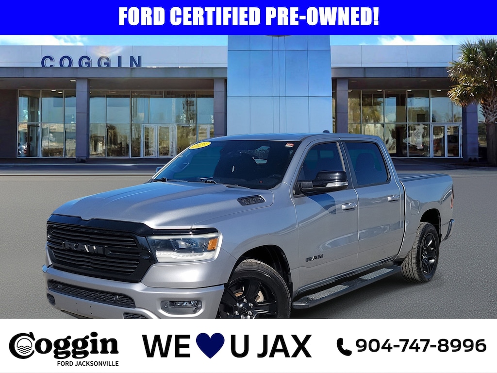 Priced below KBB Fair Purchase Price! 2021 Ram 1500 Big Horn Crew Cab 5.7L HEMI V8 Power with Night Edition Style This 2021 Ram 1500 Big Horn Crew Cab delivers the kind of muscle, comfort, and everyday usability that makes it a standout in the full-size truck segment. Under the hood, the legendary 5.7L HEMI V8 provides strong acceleration and confident towing, while the smooth 8-speed automatic keeps everything refined on the road. With a spacious Crew Cab layout and upgraded technology, its built to handle workdays, weekends, and everything in between. 5.7L HEMI V8 with MDS and VVT 8-speed automatic transmission Rear-wheel drive with 3.92 rear axle ratio Big Horn Level 2 Equipment Group Night Edition with black exterior accents and premium wheels Billet Silver Metallic Clear-Coat exterior with black interior Heated front seats and heated steering wheel 8.4-inch touchscreen with Apple CarPlay and Android Auto Uconnect with Bluetooth and voice command Remote start system Power-adjustable pedals and power driver seat with lumbar support Front and rear ParkSense parking assist ParkView rear backup camera Class IV receiver hitch with 7-pin wiring Rear power-sliding window Premium lighting group and black interior accents At Coggin Ford Jacksonville, every used vehicle is carefully inspected and priced with transparency in mind. Our guest-focused approach means no pressure, no surprisesjust a straightforward experience designed to help you find the right truck with confidence. 2021 Ram 1500 Big Horn for sale in Jacksonville, FL HEMI V8 Crew Cab truck with Night Edition styling, heated seats, touchscreen technology, and towing capability. Serving drivers from Saint Augustine, Northeast Florida, Daytona, Tampa, Southern Georgia, Kingsland, and Starke., 115V Auxiliary Power Outlet, 115V Auxiliary Rear Power Outlet, 2nd Row In Floor Storage Bins, 3 Rear Seat Head Restraints, 4 Way Front Headrests, 400W Inverter, Accent Color Premium Power Mirrors, Air Conditioning ATC w/Dual Zone Control, Anti-Spin Differential Rear Axle, Auto-Dimming Exterior Driver Mirror, Auto-Dimming Rear-View Mirror, Big Horn Badge, Big Horn Level 2 Equipment Group, Black Exterior Truck Badging, Black Headlamp Bezels, Black Interior Accents, Black Painted Exterior Mirrors Caps, Black Premium Power Mirrors, Body Color Front Bumper, Body Color Rear Bumper w/Step Pads, Bucket Seats, Center Console Parts Module, Class IV Receiver Hitch, Cluster 7.0 TFT Color Display, Deluxe Cloth Bucket Seats, Dual Exhaust w/Black Tips, Exterior Mirrors Courtesy Lamps, Exterior Mirrors w/Memory, Exterior Mirrors w/Supplemental Signals, Foam Bottle Insert (Door Trim Panel), For More Info, Call 800-643-2112, Front LED Fog Lamps, Front Seat Back Map Pockets, Full Length Floor Console, Glove Box Lamp, Heated Front Seats, Heated Steering Wheel, LED Reflector Headlamps, LED Taillamps, Manual Adjust 4-Way Front Passenger Seat, Media Hub w/2 Charge Only USBs, Night Edition, ParkSense Front/Rear Park Assist w/Stop, Power 4-Way Driver Lumbar Adjust, Power 8-Way Driver Seat, Power Adjustable Pedals, Power-Folding Mirrors, Premium Lighting Group, Quick Order Package 25Z Big Horn (DISC), Rear 60/40 Folding Seat, Rear Dome w/On/Off Switch Lamp, Rear Power Sliding Window, Rear Window Defroster, Security Alarm, SiriusXM Radio Service, Sun Visors w/Illuminated Vanity Mirrors, Universal Garage Door Opener, Wheels: 20 x 9.0 Premium Paint/Polished.