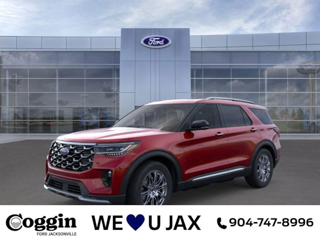 2026 Ford Explorer Platinum 4WD in Rapid Red Metallic Tinted Clearcoat luxury, technology, and power in perfect balance. This top-trim SUV stands out with its satin chrome accents, panoramic glass roof, and 20 nickel-painted wheels, creating a commanding yet refined presence that looks right at home cruising through Jacksonville or up the coast toward Amelia Island. Step inside and experience comfort that redefines everyday driving. Mojave Dusk leather seats with multicontour Active Motion massage, heated and ventilated front seats, and a power-folding 3rd row make every trip a first-class experience. Intelligent 4WD, selectable drive modes, and a Class III Trailer Tow Package give you the capability to take on any Florida weekend adventure, whether its towing the boat, hitting the trails, or navigating a rainy I-295 commute. Rapid Red Metallic Tinted Clearcoat with Mojave Dusk leather interior 2.3L EcoBoost I-4 engine paired with 10-speed automatic transmission Intelligent 4WD with selectable drive modes BlueCruise hardware with 1-year + 90-day plan (hands-free driving) Panoramic fixed glass roof with power shade 13.2 LCD touchscreen with Ford Digital Experience (Google Maps, Play Store) 12.3 digital instrument cluster B&O Sound System by Bang & Olufsen (14 speakers) 360-degree camera with Ford Co-Pilot360 Active 2.0 Adaptive LED headlamps & LED signature lighting Heated/ventilated multicontour front seats with Active Motion Heated 2nd-row seats; PowerFold 3rd-row Wireless Apple CarPlay and Android Auto 5G modem with Wi-Fi hotspot Remote start, keyless entry, and push-button start Universal garage door opener; rain-sensing wipers Class III Trailer Tow Package with Trailer Sway Control Skid plate elements; satin chrome accents; roof-rack rails Safety features: AdvanceTrac with RSC, full airbag suite, SOS Post-Crash Alert, LATCH, TPMS, perimeter alarm Warranty: 3yr/36k bumper-to-bumper; 5yr/60k powertrain & roadside assistance EPA fuel economy: 23 MPG combined (20 city / 27 highway) Total MSRP: $57,050 Why buy from Coggin Ford Jacksonville We believe buying a vehicle should be easy, transparent, and centered on you. Every Explorer at Coggin Ford Jacksonville undergoes a thorough inspection and comes with our clear, market-based pricingno games, no surprises. Enjoy friendly, professional service, competitive financing, and ongoing support from our factory-trained technicians right here in Jacksonville. Jacksonville Ford Explorer Platinum, Rapid Red Explorer 4WD, BlueCruise SUV, luxury 3-row SUV Northeast Florida, St. Augustine family SUV, Orange Park, Ponte Vedra, Beaches, Southern Georgia & Kingsland shoppers., 4WD.
